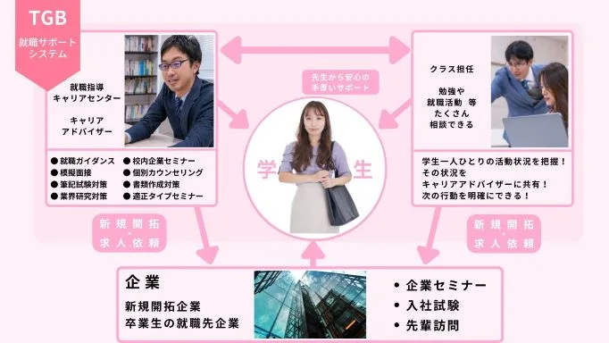 就職さえできれば、どんな仕事でもいいのでしょうか? TGBは面倒見がいい企業を学生のみなさんに紹介します。 だから離職率が非常に低く、正社員率も100%の就職が実現できるんです。 学んだこと、好きなことを仕事に結びつけるため教職員一同でとことんサポートします。 また、優秀な卒業生たちの活躍により各業界からの求人が集まります。 その結果、希望する業界へ続々と就職に結びつくのです。